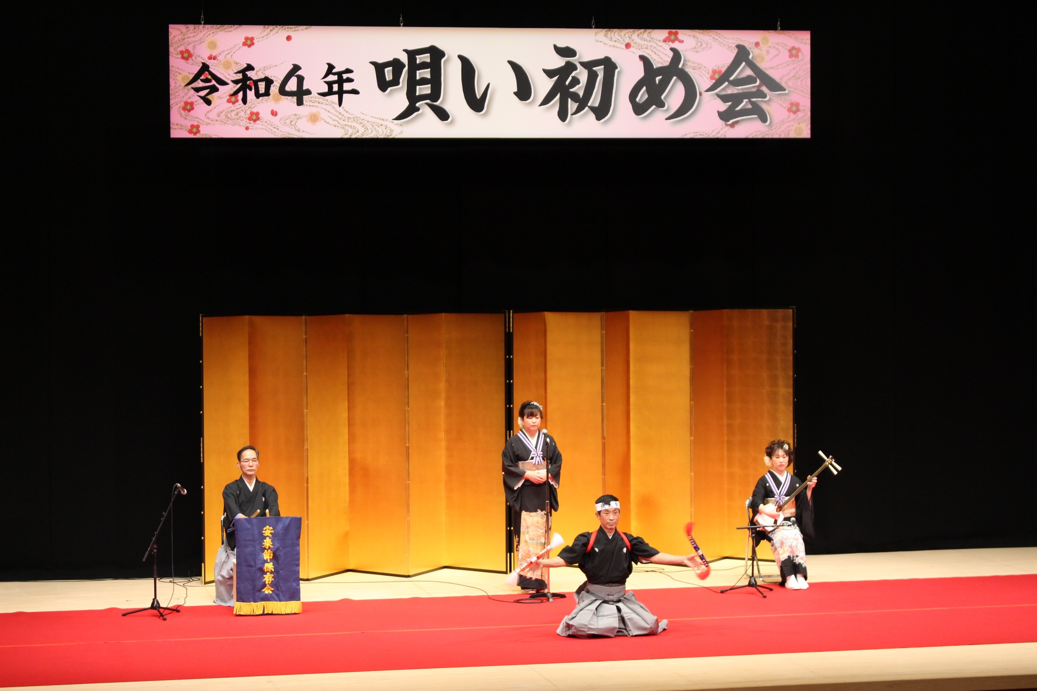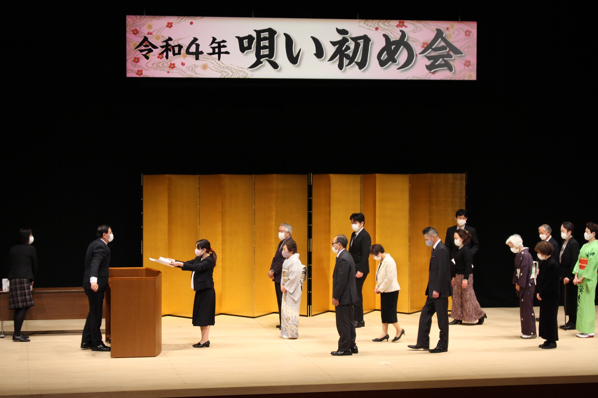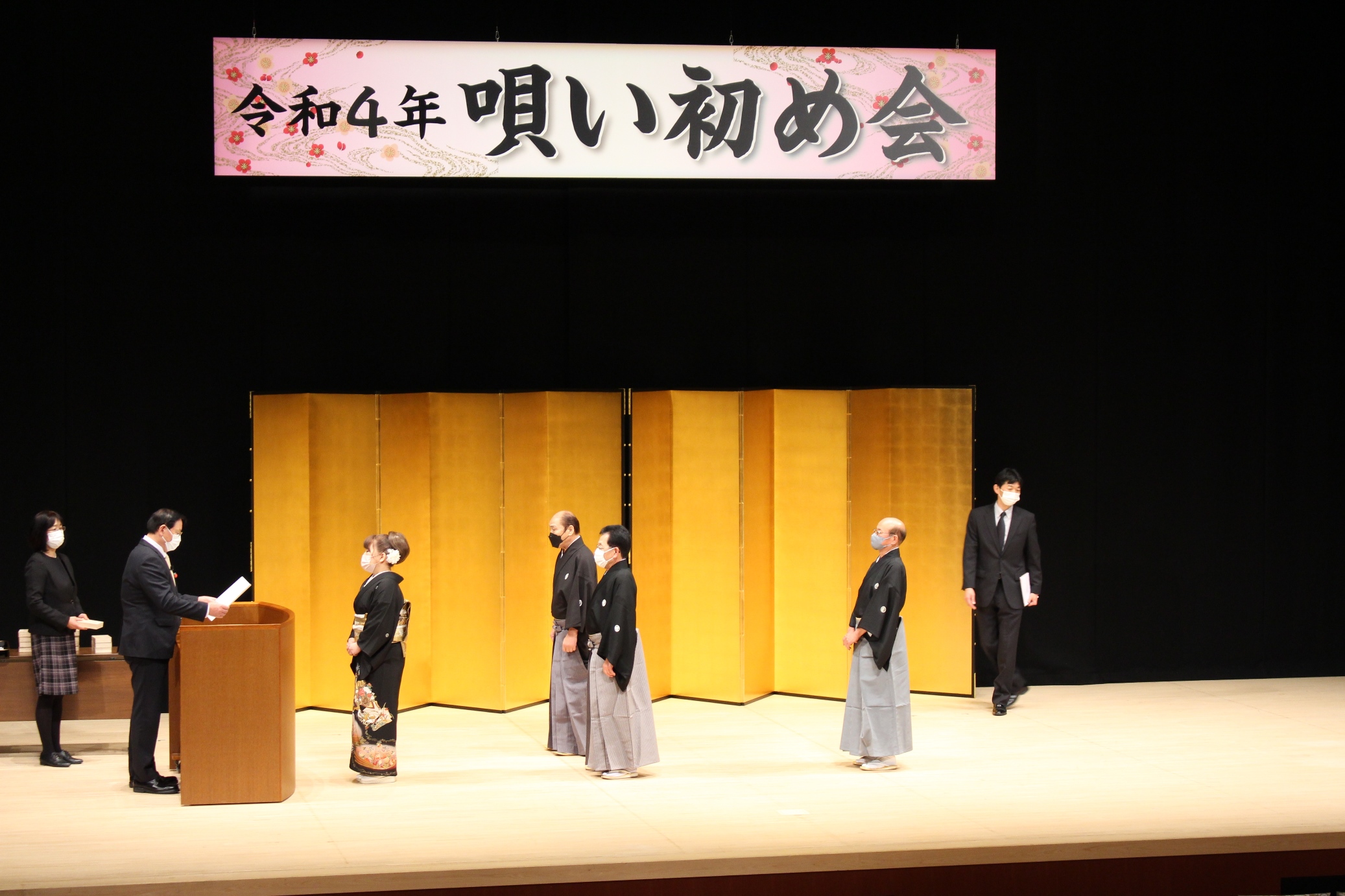 令和4年「唄い初め会」 令和4年1月10日に2年ぶりに「唄い初め会」を開催いたしました。 会場を例年の「安来節演芸館」から安来市総合文化ホール「アルテピア」に変更し、客席の間隔を設けるなど、新型コロナウイルス感染症対策を講じた上の開催でした。 ご来場いただいた皆様には、ご協力をいただき、誠にありがとうございました。 1日でも早く新型コロナウイルス感染症が終息し、通常開催できることを願ってやみません。 上位昇格者免除授与 会員功労者表彰